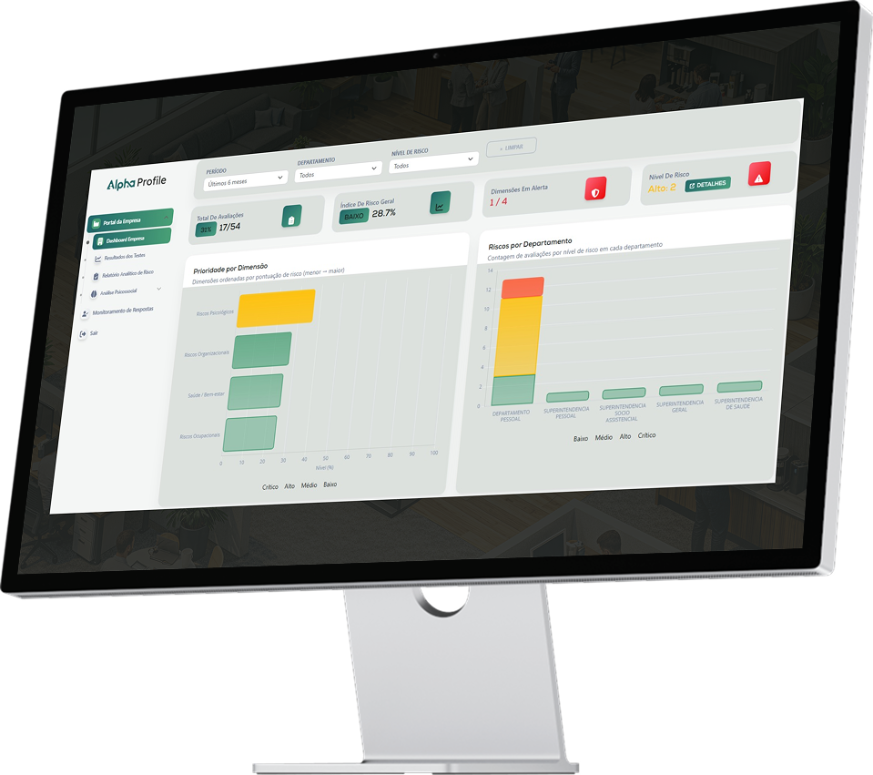 A tecnologia da Alpha Profile organiza informações complexas e transforma dados comportamentais, riscos psicossociais e indicadores organizacionais em direcionamento claro para a tomada de decisão.